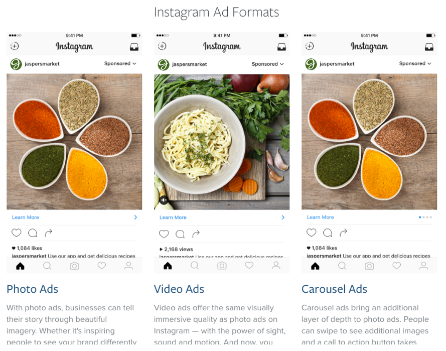 There are several different formats of Instagram advertising, all of which focus on visual presentation. You can choose from (1) Photo Ads (2) Video Ads or (3) Carousel Ads, which allow visitors to swipe through multiple photos.