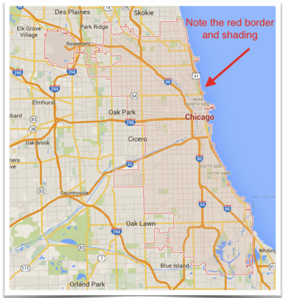 Step 1: Go to Google Maps and search the city name (and state). Google will highlight the area on the map that belongs to that city. In the screen shot below you will see that I typed in Chicago, Illinois. The area that is within the red border (and is also shaded red) is considered to be within the city of Chicago.